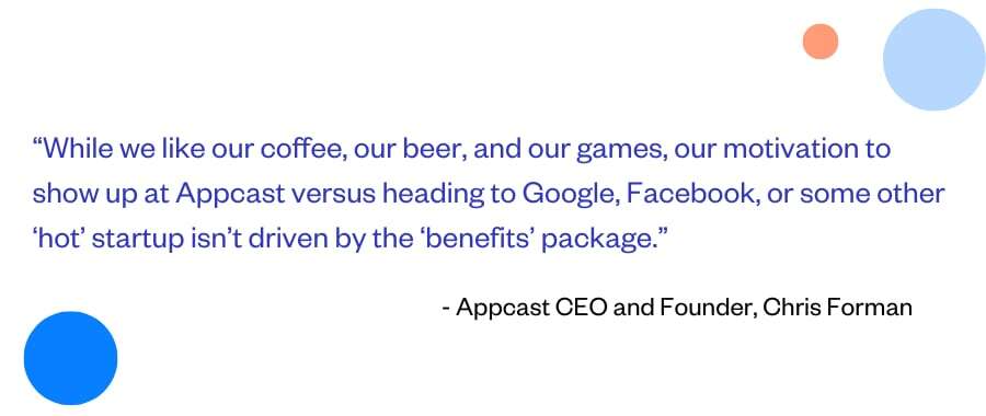 Our CEO and Founder Chris Forman sets a great example of what it means to put culture first. For instance, at our annual end of year meeting, the metrics that he is most proud to share are: number of first homes purchased by employees (in 2021 that number was 15), babies and grandbabies born (7), Appcastians married or engaged (18) and those who recently graduated (14). I can’t wait to hear what the new metrics will be later this year!