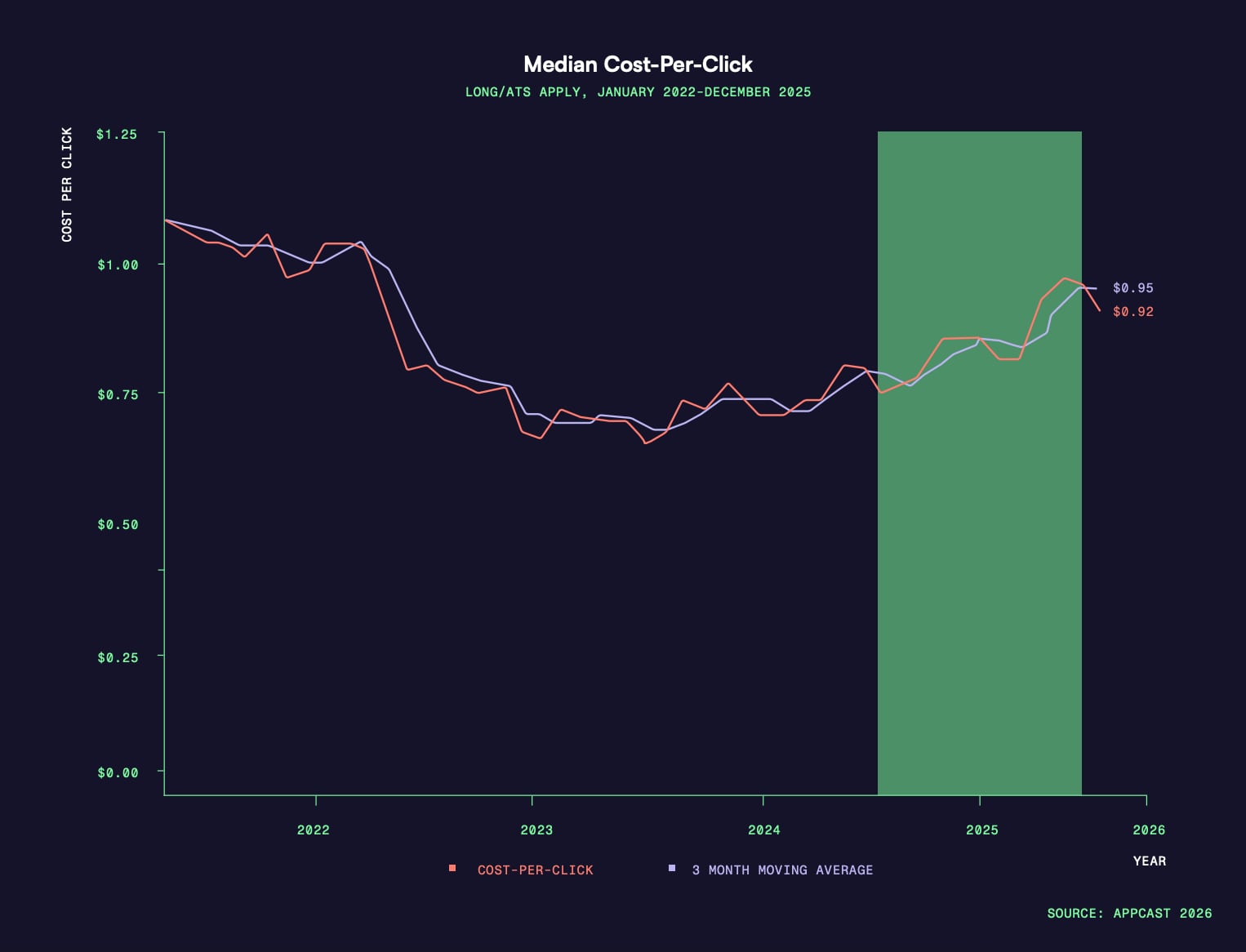 For most of 2023 and 2024, it looked like recruitment costs were finally cooling off. But then cost-per-click (CPC) took off again.