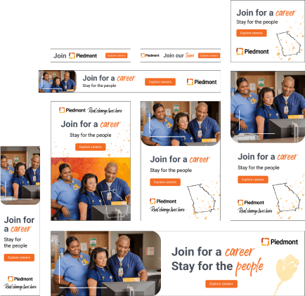 The goal was to create a Georgia-infused, research-informed identity designed to set Piedmont’s career site apart, along with subsequent creative recruitment marketing deliverables. Working closely with the Piedmont team, Appcast’s strategists, writers, and designers created a flexible messaging system that can be tailored to show Piedmont’s culture and job opportunities to candidates across multiple roles. By showcasing Piedmont’s Georgia locations and mission, the organization was able to increase visibility across future talent pools in the area.