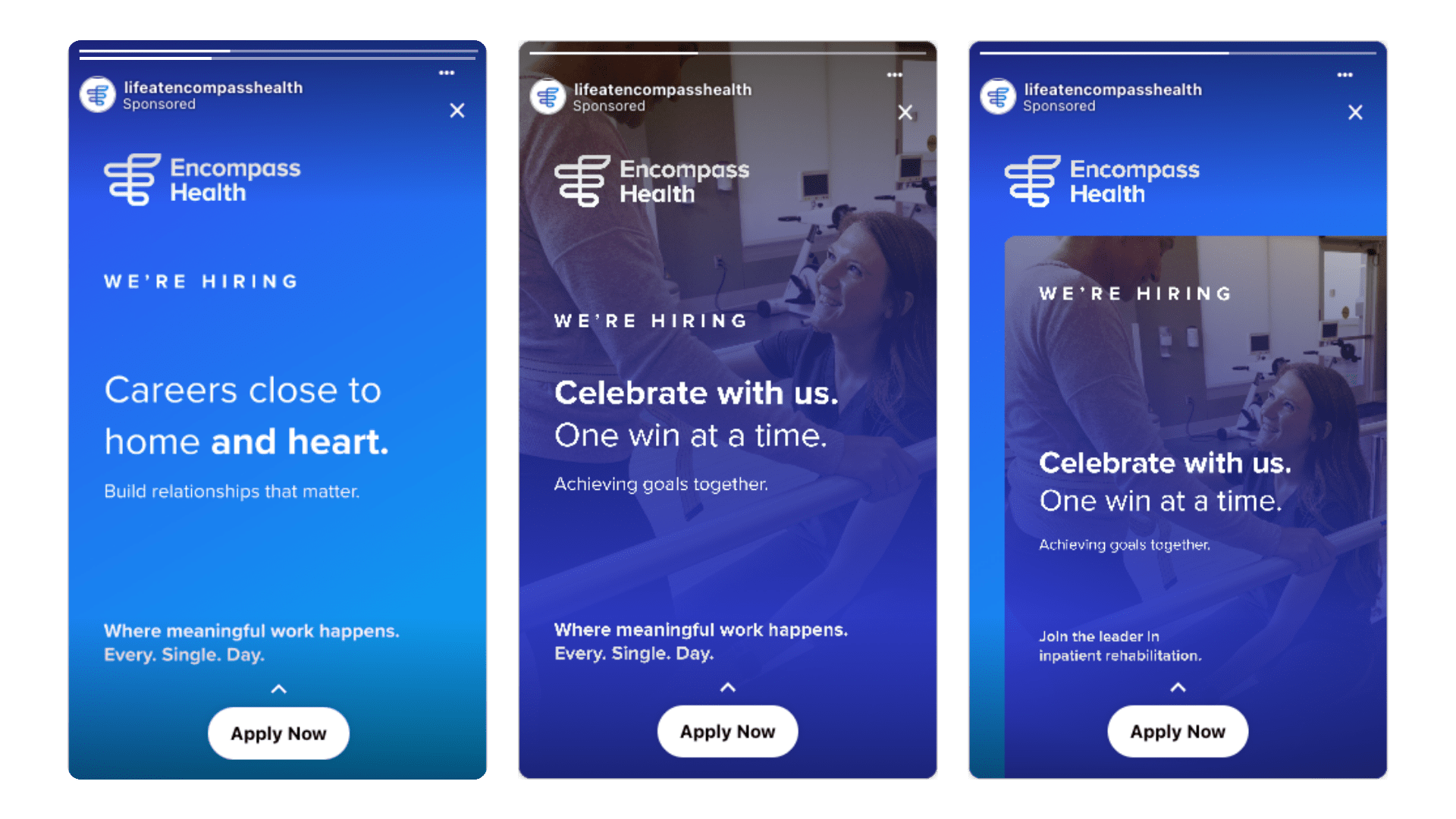 Employer Value Proposition (EVP) Development: Led by Appcast’s team of EVP expert strategists, designers, and writers, Encompass Health first underwent a complete EVP overhaul. This process allowed them to uncover the values of their target candidate segments and create an ownable brand identity that shows up consistently on their site and across all advertising efforts. You can learn more about the EVP overhaul here.