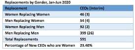 Of 591 replacement CEOs recorded in the first half of 2020, 138 or 23.4% were women. This is up from 21.6% of female CEO replacements in the first half of 2019 and 18.6% in the first half of 2018.