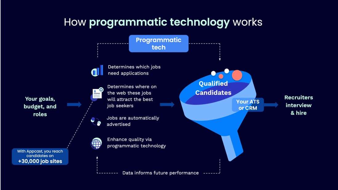 Programmatic technology optimizes the hiring process, using data to fill the bottom of your hiring funnel with quality candidates. Like any effective recruitment marketing strategy, different channels play a role in attracting talent to your organization: Programmatic job advertising gets the application and other channels – like search, social, or other online or offline media – will help engage, generate, and nurture the leads.