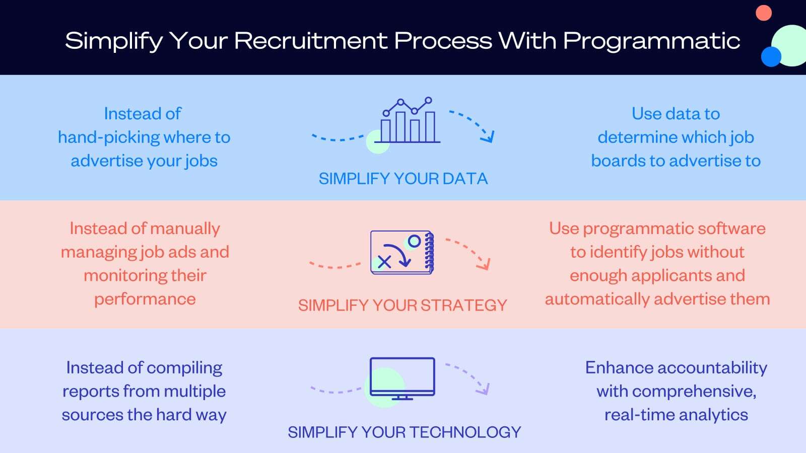 With programmatic job advertising, recruiting leaders no longer have to track the performance of multiple job boards because the software does it for you! Programmatic software ensures the desired number of candidates on time and on budget. Most importantly, this technology tracks spending, keeping recruiters up to date on key recruiting costs and data like cost-per-application, cost-per-click, and apply rate, to understand if they need to revise their strategy to navigate a challenging labor market, or perhaps adjust job ad content to better reflect their target job seeker’s preferences! Recruiting leaders can rely on this visibility to feel confident in programmatic technology’s performance.