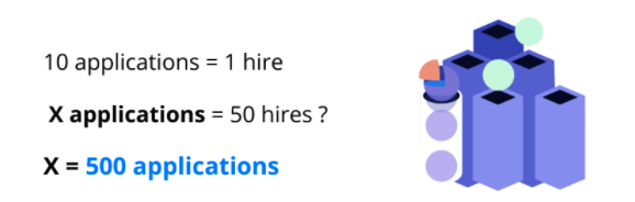 We work backwards from your hiring goals, and use the concept of application to hire ratio (one of the many useful metrics in your recruiting funnel!). In other words, how many applications does it take for you to make 1 hire? For example, if it takes 10 applications to make one hire (and we need 50 hires), then we know that we need 500 applications to generate those 50 hires.