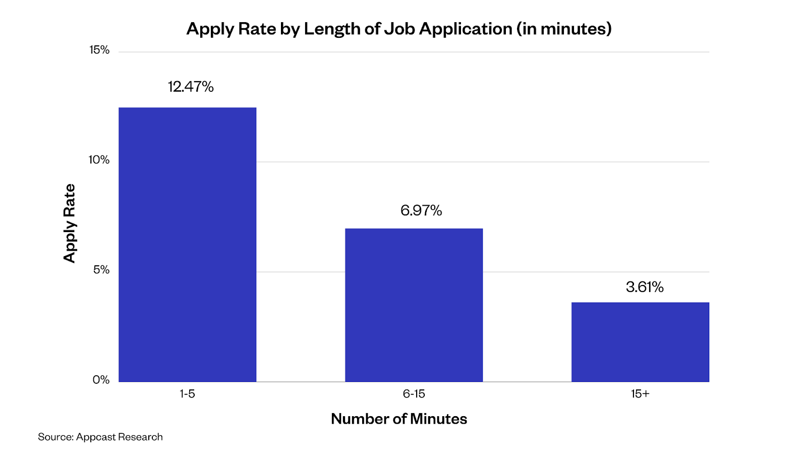 So you’ve heeded my advice, cut the down-the-funnel questions, removed repetitive processes, and then optimized your application for mobile. I can’t tell you how much that means to me. Now I have one last ask: go through your application and time how long it takes you to finish on both desktop and mobile, and note any points of friction (including some of those mentioned above). Our research (highlighted in the first chart in this blog) shows that an application that takes less than 1-5 minutes sees an apply rate four times larger than one that takes longer than 15 minutes. So, buckle up, go through your application (and don’t rush! I know you know the questions!), and prepare to judge your work.