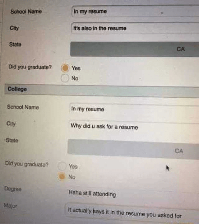 So you ask for a resume. Okay! Lovely way to learn about your candidate and their work experience. The candidate attaches their resume. No complaints here. But – then your candidate keeps clicking to the next page and… GASP! Blank field upon blank field asking for previous work experience. Now your candidate has to take the time to fill out information they have already given you. You’re certainly at risk of losing potential candidates if you double-dip like this.