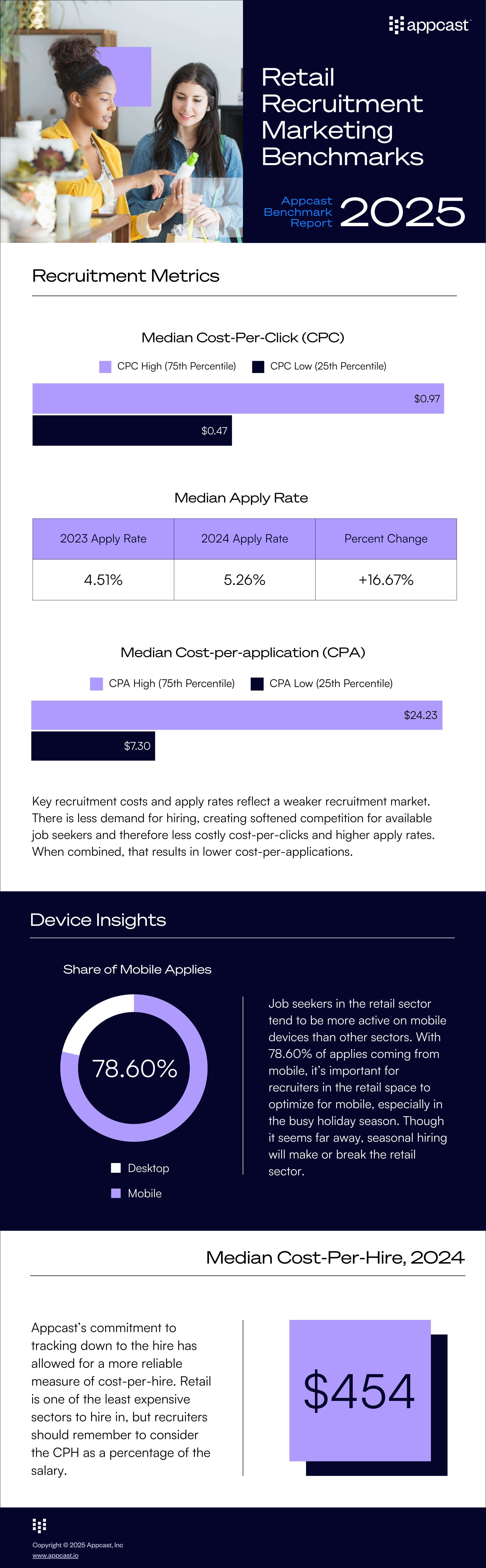 The retail sector has seen demand calm in recent years, but hiring challenges still remain, especially during the busy holiday season. The 2025 Recruitment Marketing Benchmark Report features key recruitment marketing benchmarks for retailers, and we have gathered some of those benchmarks here: