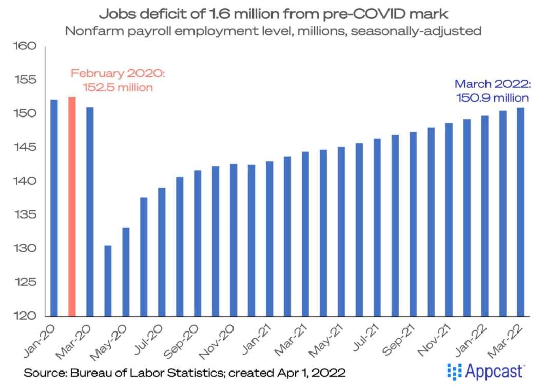 In addition to the stellar March numbers, the February figure was revised upward to 750,000 jobs. Job growth is strong and steady – the Q1 2022 average payroll gain of 562,000 matched the average for all of 2021. The job deficit compared to pre-pandemic times has shrunk dramatically over the last year, down to 1.6 million. 93% of all jobs lost during the COVID recession have been recovered, and the labor market recovery should be complete by the summer.