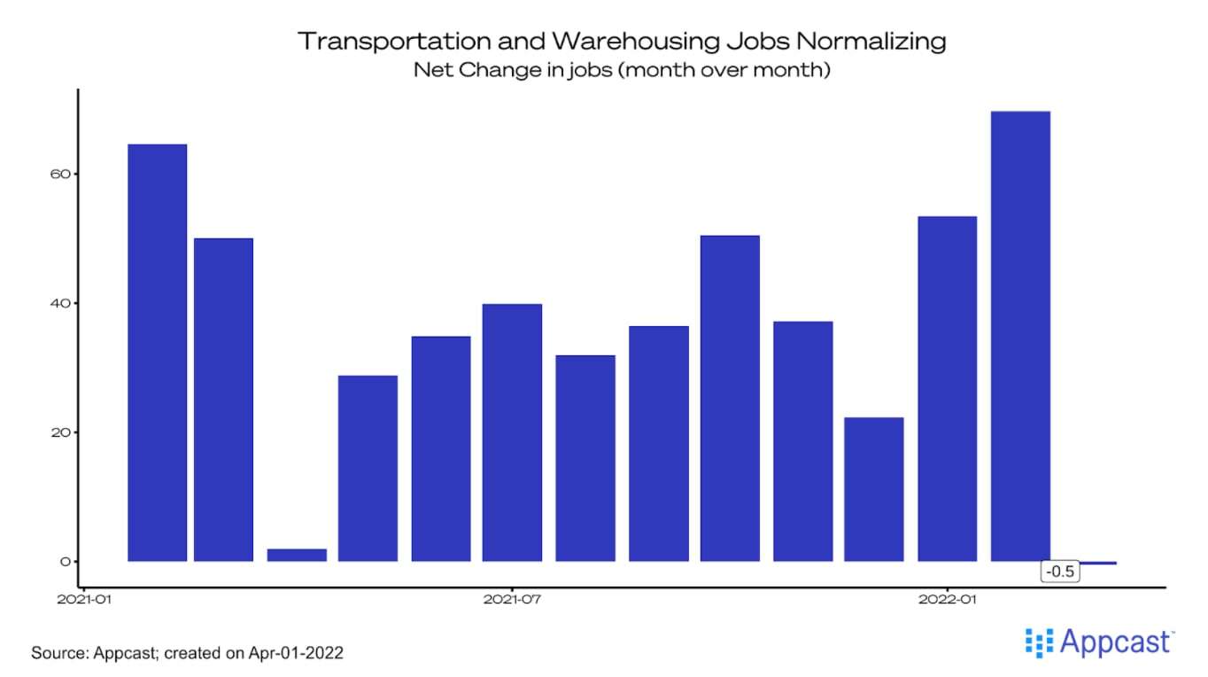 Transportation and warehousing jobs, which had been a steady source of growth for the past two years, actually declined by 500 jobs in March – a sign that the boom in ecommerce activity may be normalizing. This is the first monthly decline since the pandemic.