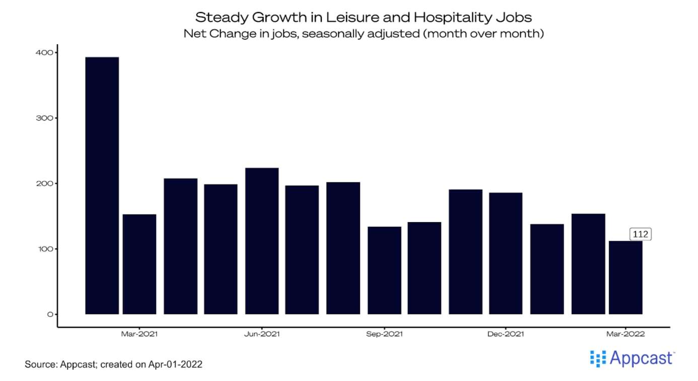 Otherwise, the industry-level changes in job growth reflect a transition toward services, a slight course correction from the pandemic-era economy. As COVID cases have plummeted from the highs during the Omicron surge in January, leisure and hospitality jobs grew by 112,000 and retail jobs grew by 49,000.