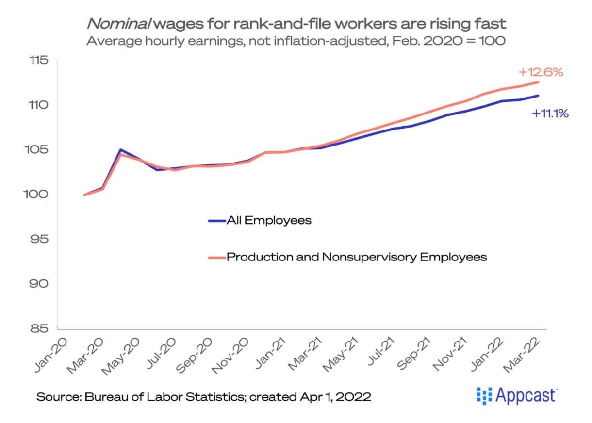 Wage growth continues to remain elevated. Average hourly earnings for all workers rose to 5.6% year-over-year. Average hourly earnings for rank-and-file workers – production and nonsupervisory employees – were up 6.7% year-over-year. From February 2020, nominal wages are 12.6% higher for rank-and-file employees, and up 11.1% for all workers. But as we all know, these are nominal gains – or not adjusted for inflation – and consumer price inflation is at a 40-year high.