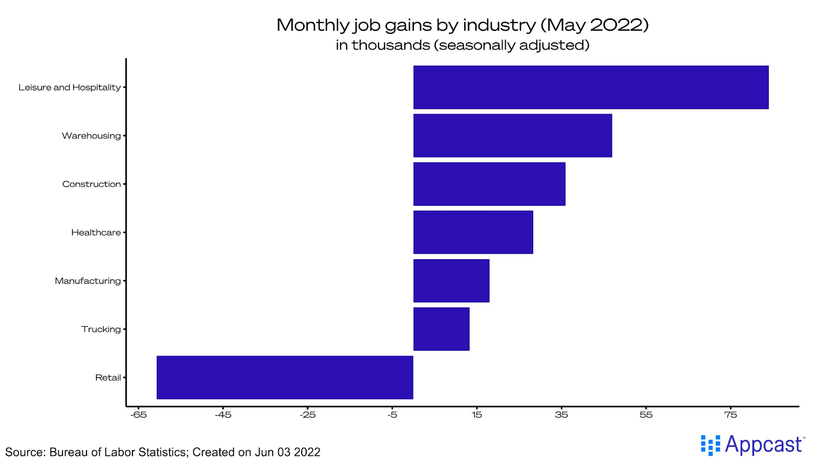 The U.S. economy added a solid 390,000 net new jobs in May 2022. The unemployment rate remained unchanged at 3.6%, nearly a 50-year low. Broad-based job gains (aside from retail), moderating wage growth, and labor force participation recovering – all these are signs the jobs recovery is in the home stretch, meaning that in the next few months employment will crest above pre-pandemic levels.