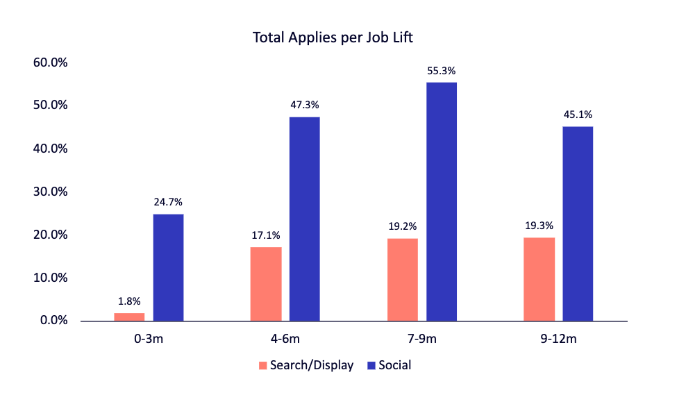 Appcast Brand Ads is not just about social channels, though. Appcast research shows that strategically layering social media into your recruitment marketing mix can drive longer-term impact of up to 55% lift in applies across all channels.