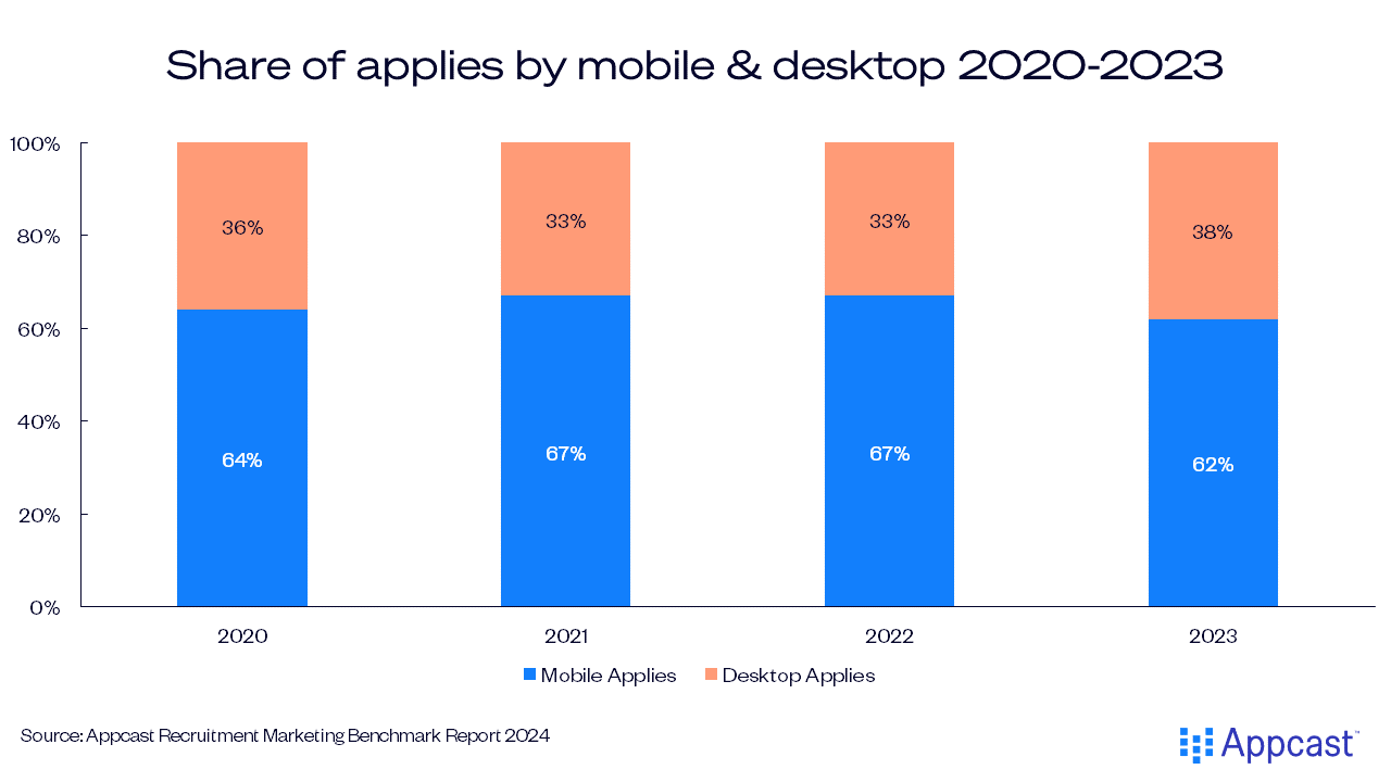 Over time, job application methods have evolved from traditional letters to e-mail and online platforms. The global rise in smartphone usage has sparked a notable shift in device preferences. Despite a slight decrease in mobile job applications in 2023, a significant number of job seekers, particularly those in the gig economy, prefer using mobile devices for their job applications. However, desktop applications remain prevalent in sectors that heavily rely on computer usage, such as tech and finance. Employers should tailor their recruitment strategies to match the preferences and behaviors of their target candidates, reducing friction in the application process, and considering factors such as age, profession, and preferred methods of application.