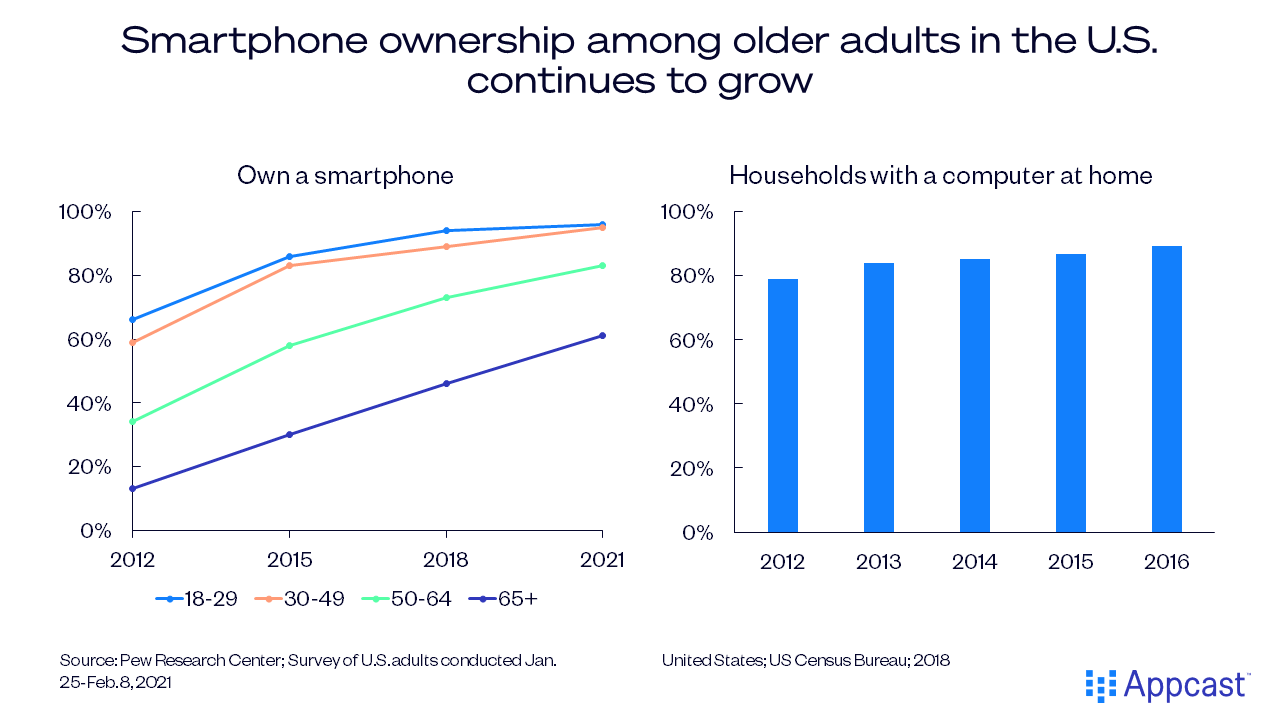 Access to the Internet is expanding globally across all age groups. In 2016, nine out of 10 U.S. households had a computer at home. Today, younger individuals are more likely to own a smartphone than a computer. A 2021 survey by the Pew Research Center indicates that today nearly every individual aged 18 to 49 and more than 80 percent of those aged 50 to 64 in the U.S. own a smartphone. The average time spent daily on a phone has also been increasing steadily within the past years, reaching a total of 4 hours and 30 minutes in April 2022.