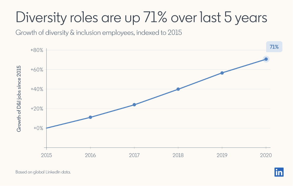 LinkedIn data shows a steady increase of employees in diversity and inclusion roles over the last five years.