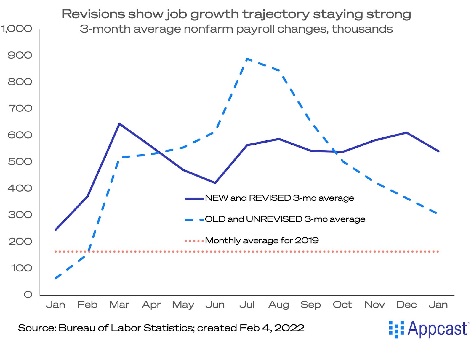 The labor market is booming even more than we thought. The U.S. economy added a shocking 467,000 net new jobs in January 2022, far above expectations, despite the surge of Omicron cases that saw 15 million people get COVID last month. But perhaps more surprising, were revisions to monthly data for all of 2021 that radically changed our understanding of the labor market’s trajectory. Instead of a slowing trend from last summer, job growth looks to be holding steady, and finished 2021 with an upswing.