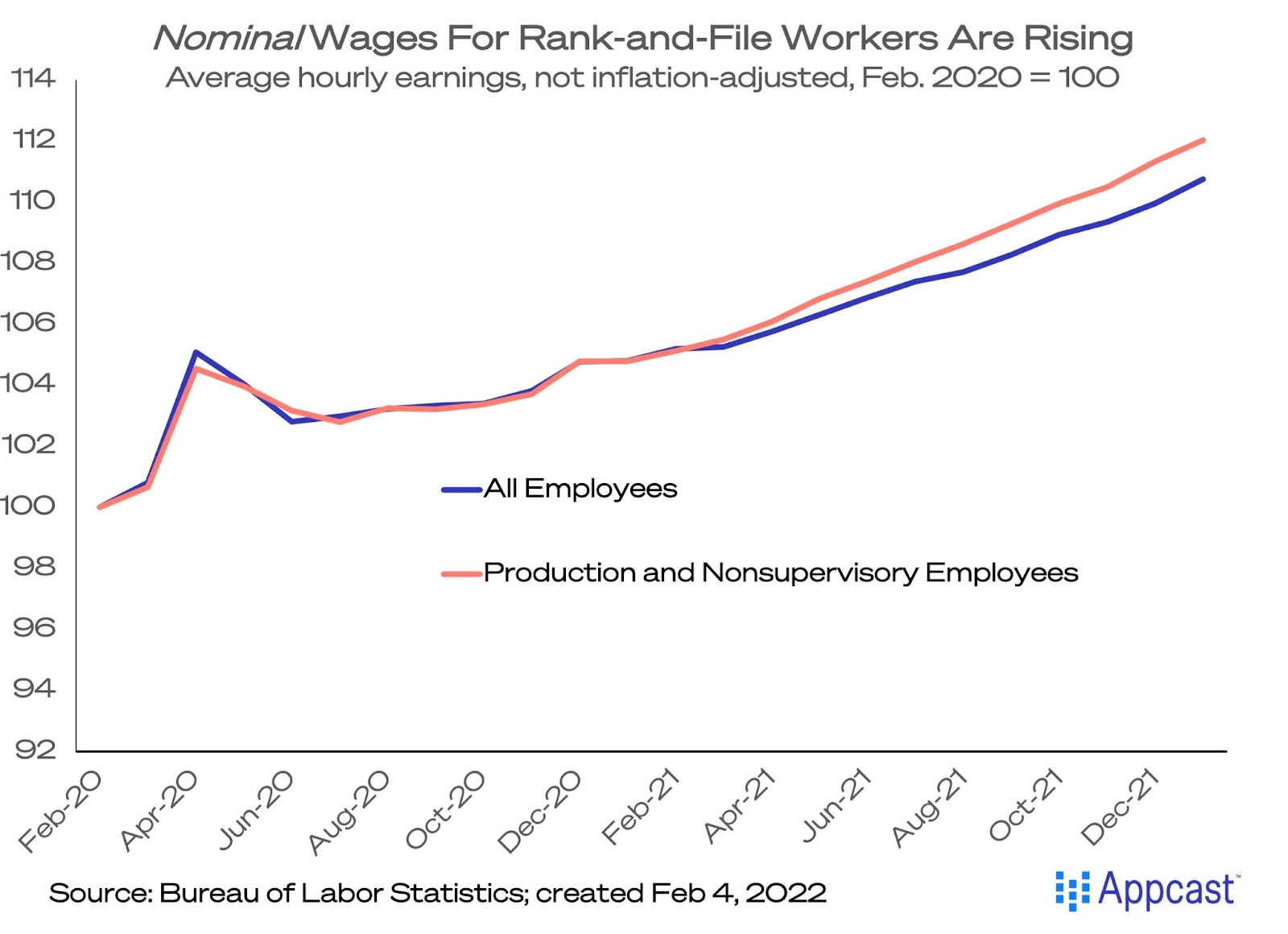 Wage growth continues to be very strong. Average hourly earnings for all workers accelerated to 5.7% year-over-year. Average hourly earnings for rank-and-file workers – production and nonsupervisory employees – were up 6.9% year-over-year. From February 2020, nominal wages are 12.0% higher for rank-and-file employees, and up 10.7% for all workers. But as we all know, these are nominal gains – or not adjusted for inflation – and consumer price inflation is at a 40-year high.