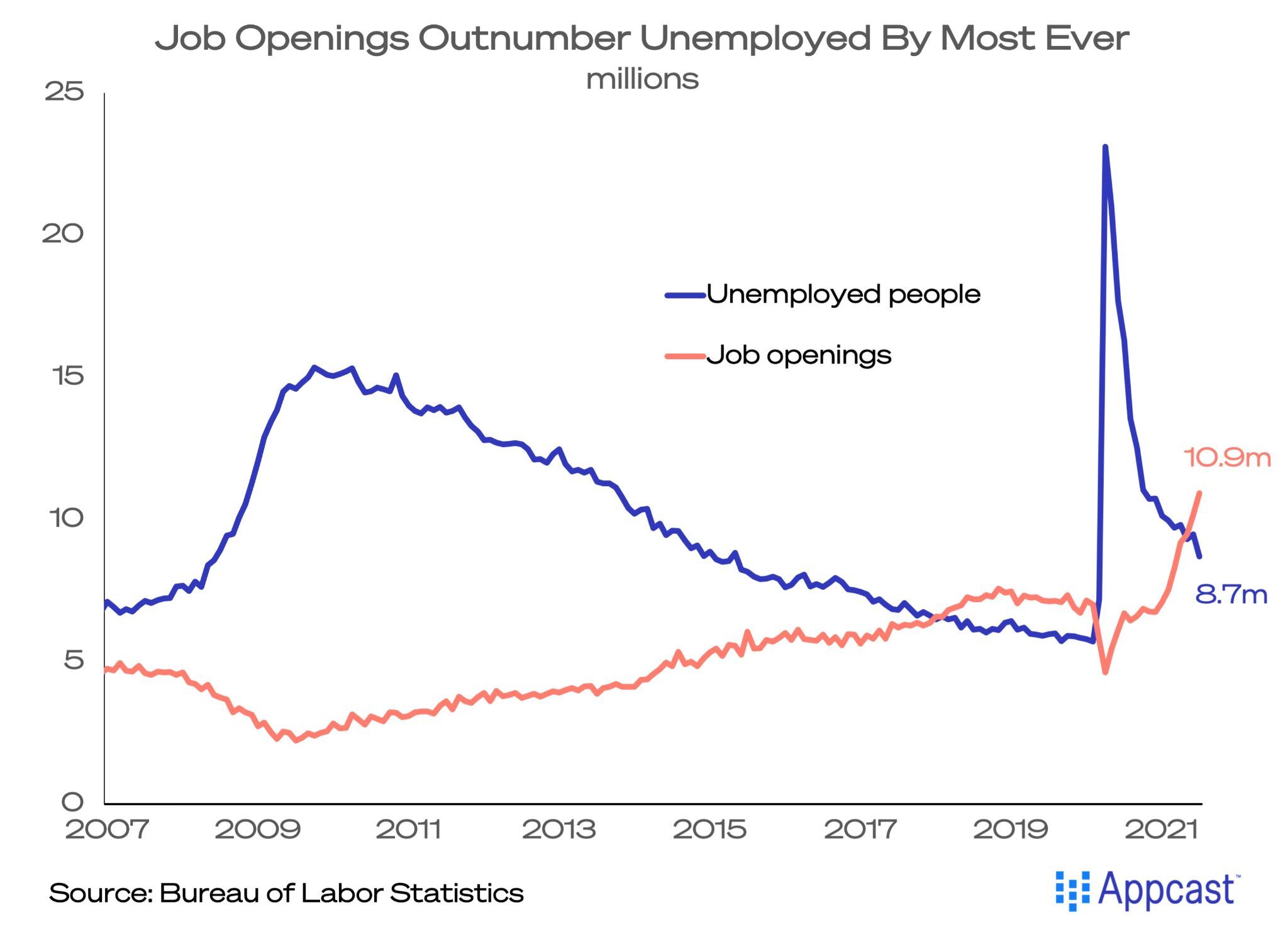 It’s a challenging time for recruiters. There is a fundamental mismatch between the supply of and demand for workers, perhaps without precedent in recent decades. And one chart clearly shows that we’re in uncharted territory: