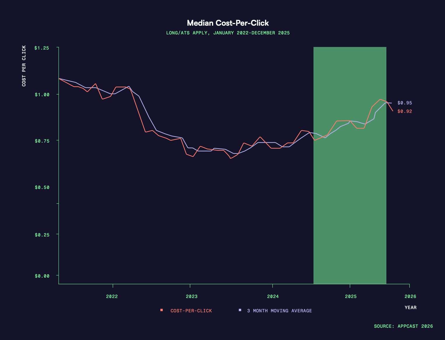 For most of 2023 and 2024, it looked like recruitment costs were finally cooling off. But then cost-per-click (CPC) took off again.