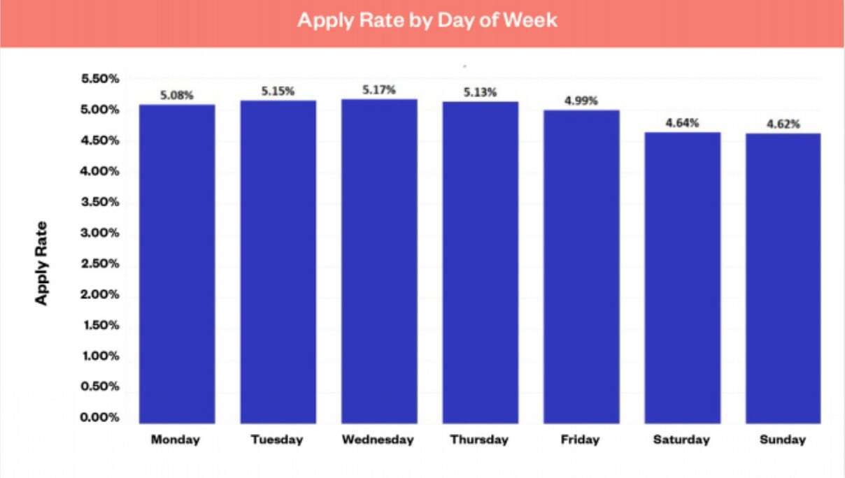 Note: This chart shows the apply rate for each day of the week. For example, for all the people who click on jobs on Wednesday, 5.17% of them actually apply for those jobs.