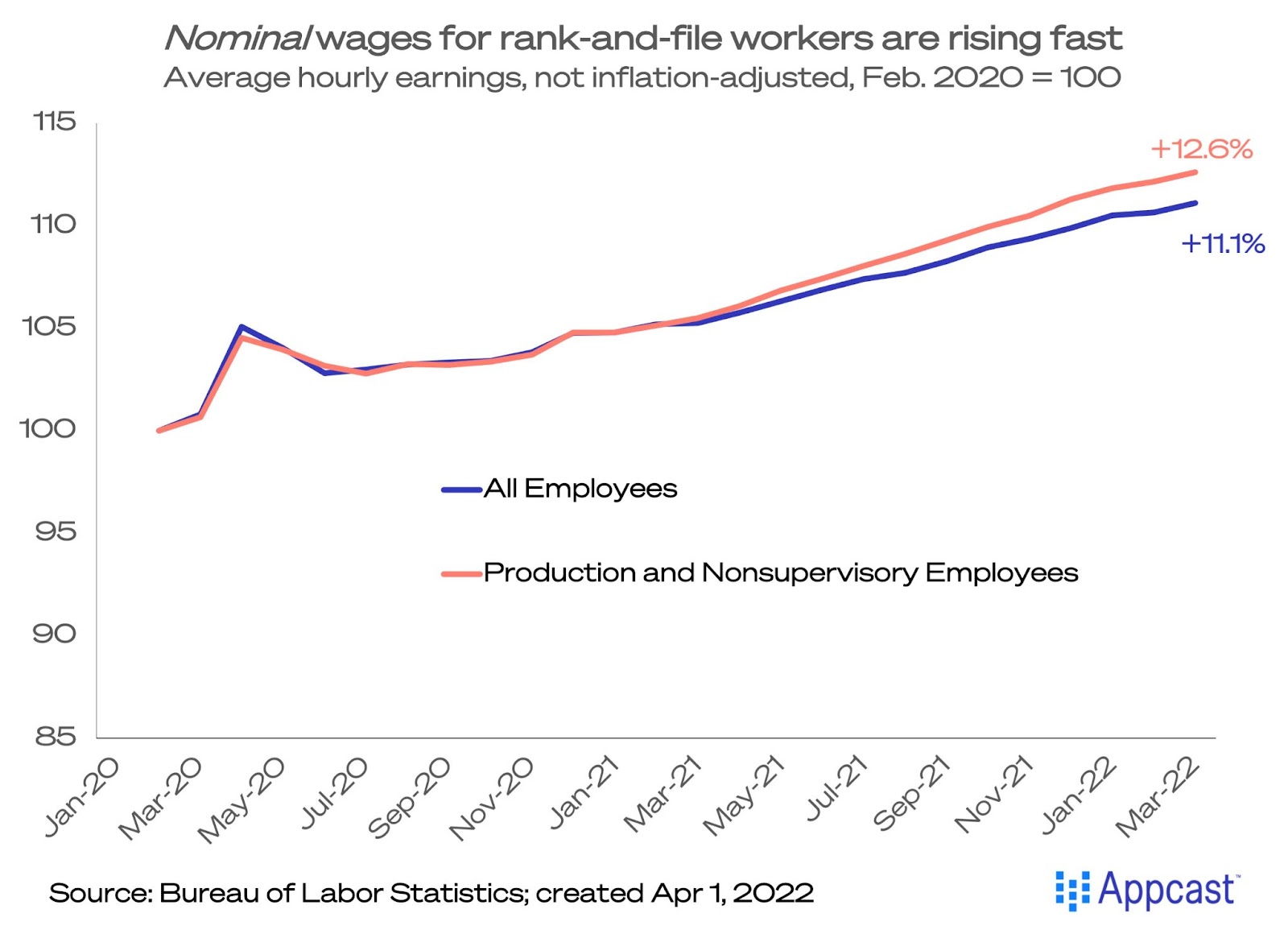 An uptick in work pay coincided with this inflation surge. The labor market is extremely “tight” – with job openings at near record highs and jobs being added at a rapid pace – and so employers are raising wages to attract job seekers. Average hourly earnings were up over 11% for all employees in March 2022 compared to February 2020, just when the pandemic recession began. Wages are even higher for “rank-and-file” workers (production and nonsupervisory employees): up 12.6% over the period.