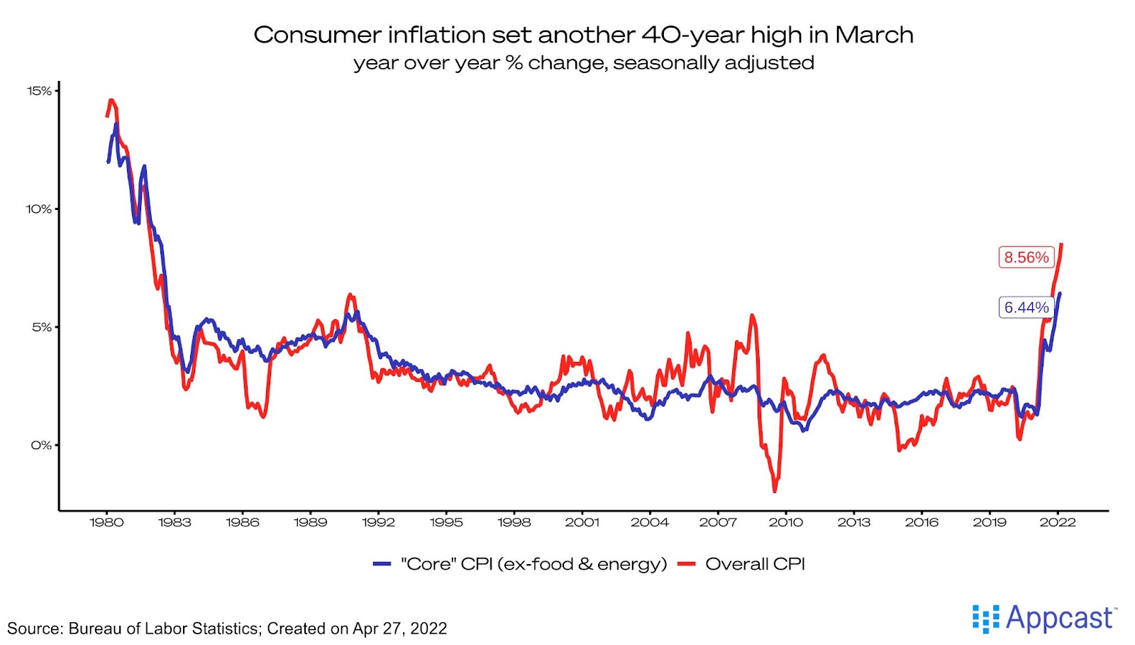 For most of the last three decades, inflation was stable in the 2 to 3% range but not so in the last two years. Coming out of the COVID-induced recession of 2020, prices have risen at rates not seen since the early 1980s. Earlier this month, the Bureau of Labor Statistics (BLS) reported that the Consumer Price Index (CPI) rose 8.5% in March compared to a year earlier. That set another 40-year high. Even the less volatile “core” CPI – which strips out food and energy components that can fluctuate wildly – was up 6.4% year-over-year, the highest since 1982.