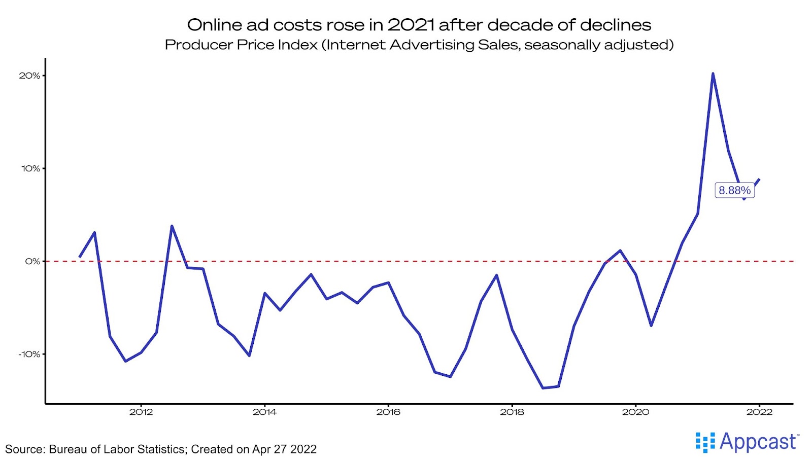 2021 marked a reversal of this trend. Costs began to surge in the spring of 2021 in a way they never had before. In June, online ad prices were up 26.2% from a year before. Surely, a big explanation for this reversal is that the pandemic triggered a sharp shift upward in online activity from consumers (what else were they going to do?). And so businesses, sensing the end of the worst of the pandemic in the spring of 2021, began bidding against each other to reach those individuals where they were: on the internet.