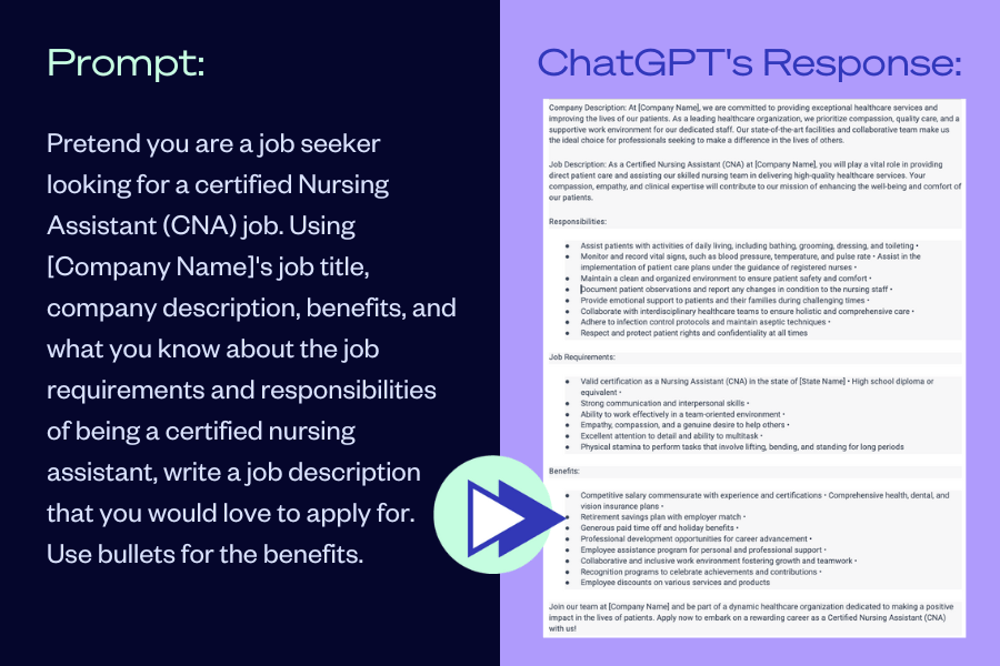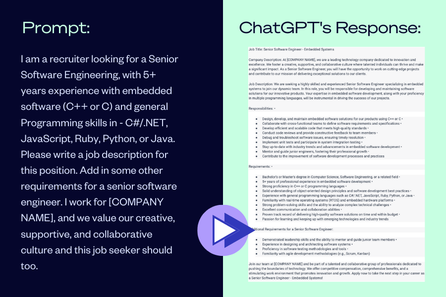 For instance, say a recruiter is writing a job ad. This recruiter usually sets some time aside, explores what the job title entails, and strings together buzzwords and company expectations for some time before they get the perfect job description. Instead, this recruiter can plug the job title into ChatGPT and easily prompt it to write a short job description. And if she doesn’t like the job description? She can be curious: switch up the prompt, then do it again and again until this recruiter is happy with the job description! Then, moving forward, she’ll know how to prompt to get the answer she wants. It’s important to proofread these responses – but even manually editing the AI response will save time compared to writing the job ad from scratch.